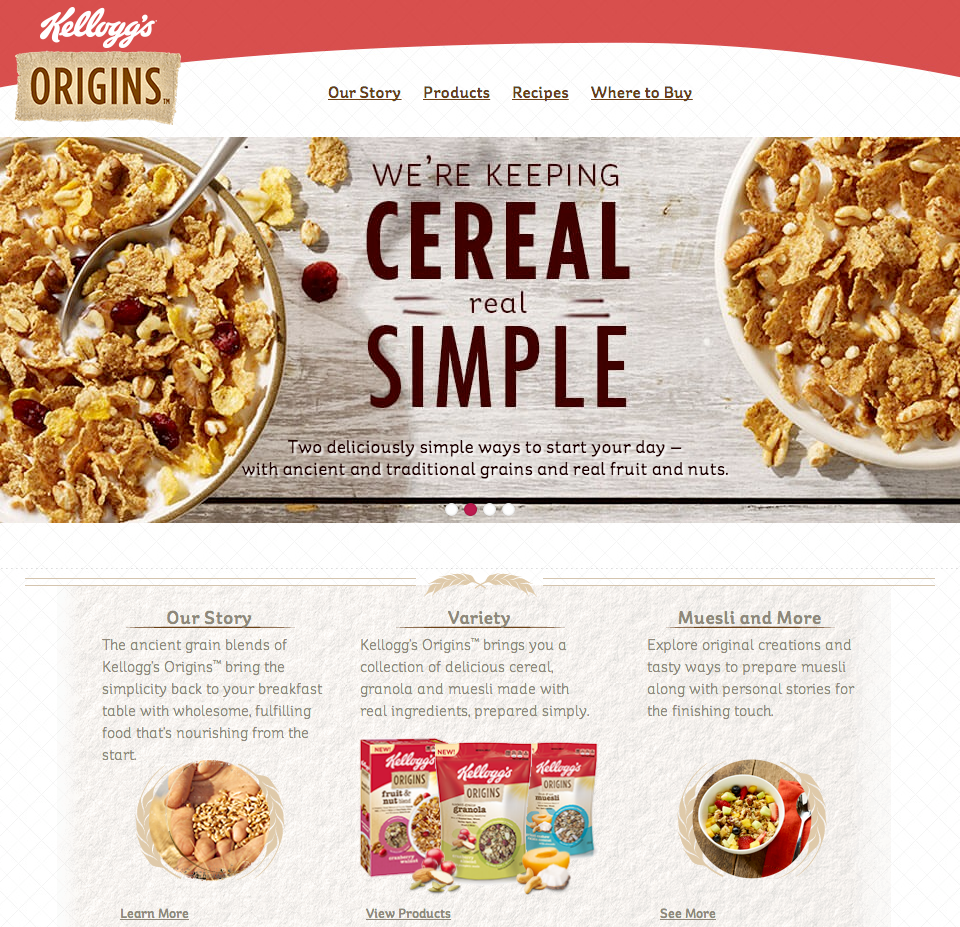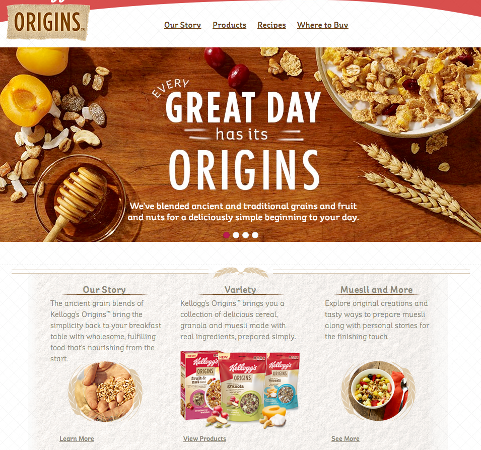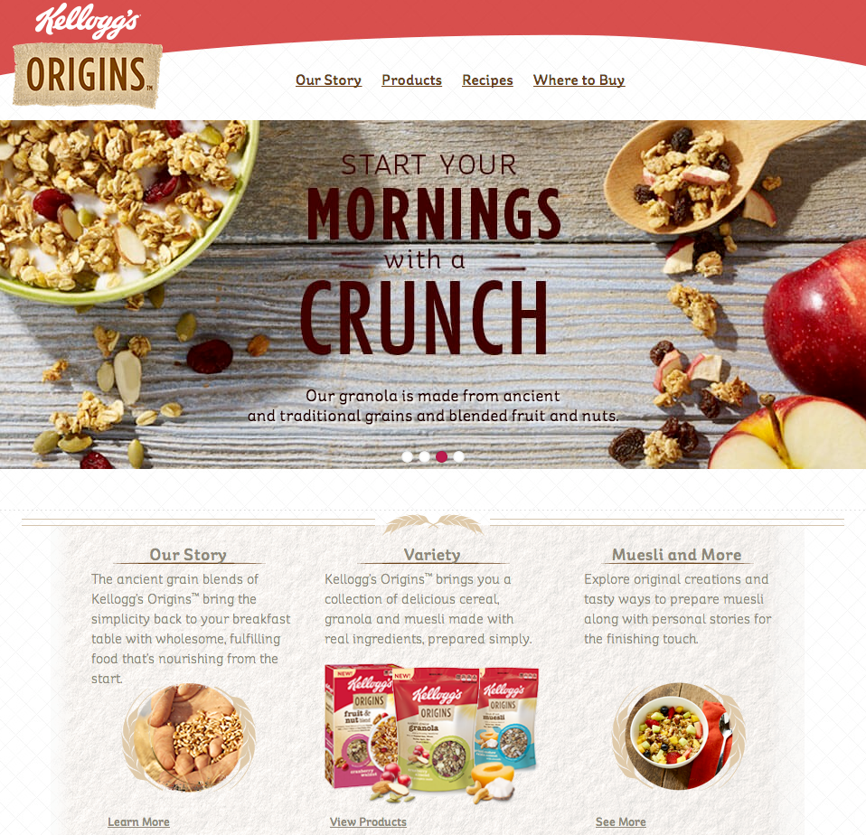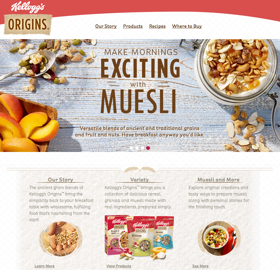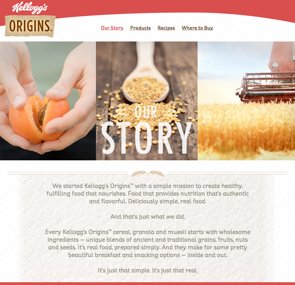 www.kelloggsorigins.com/en_US/home.htmlKellogg’s Origins was a new product line in the US. We created the brand story, visual approach, website, and corresponding promotional content in time for launch—on a 4-week timeline.